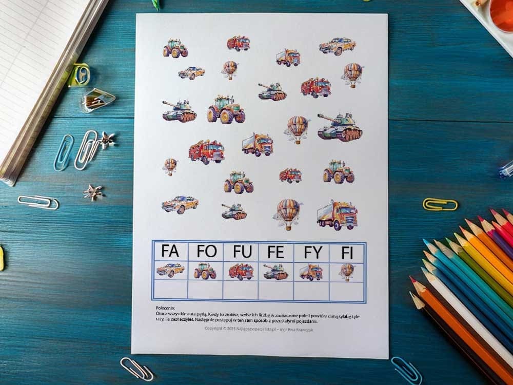 To zadanie z zakresu kategoryzacji pojazdów, które nie tylko wspiera automatyzację poprawnej wymowy głoski F, ale również angażuje dziecko w różnorodne operacje umysłowe.