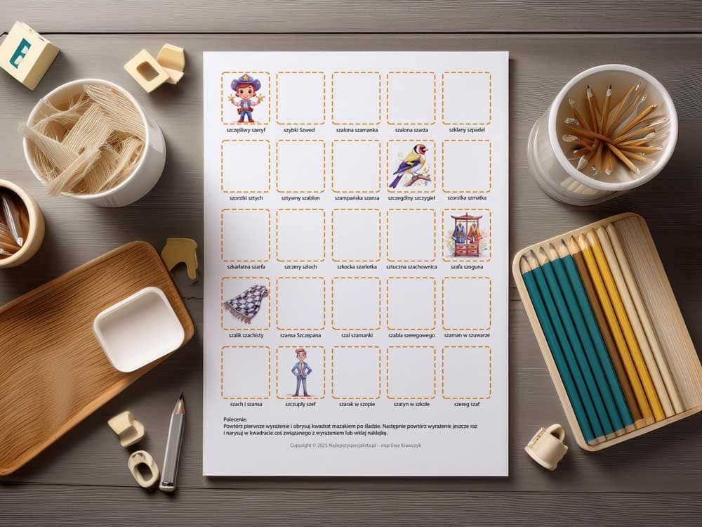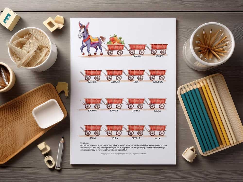 Każda karta została starannie zaprojektowana, aby skutecznie ćwiczyć głoskę „sz” w nagłosie, śródgłosie oraz wygłosie – w sylabach, wyrazach, związkach dwuwyrazowych i zdaniach. - Metodologicznie uporządkowany materiał